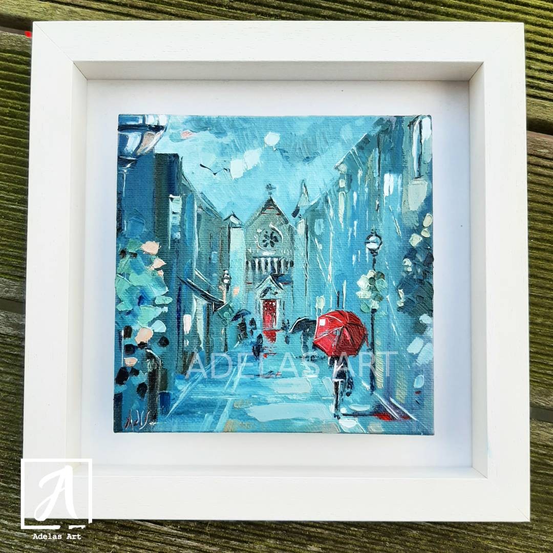 External frame size: 24x24cm. You will get the original artwork, a one-of-a-kind oil painting, in a modern white wooden frame. Packaged with care and shipped to you ready to hang on your wall!