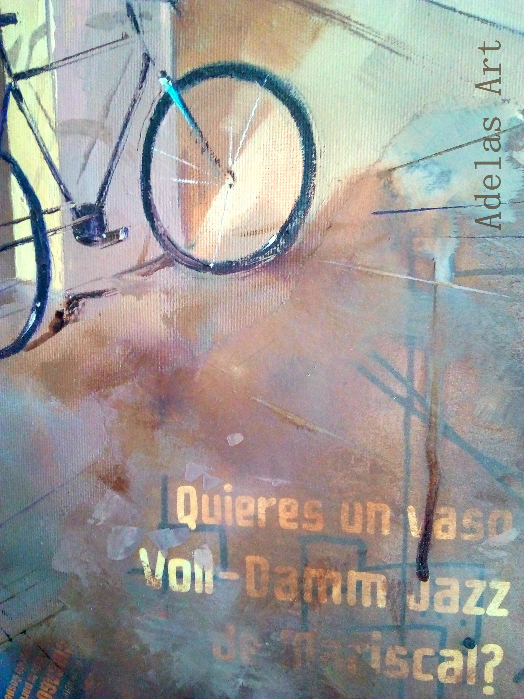 Type: oil painting that discretely includes modern mix-media elements (paper collage) into the canvas composition