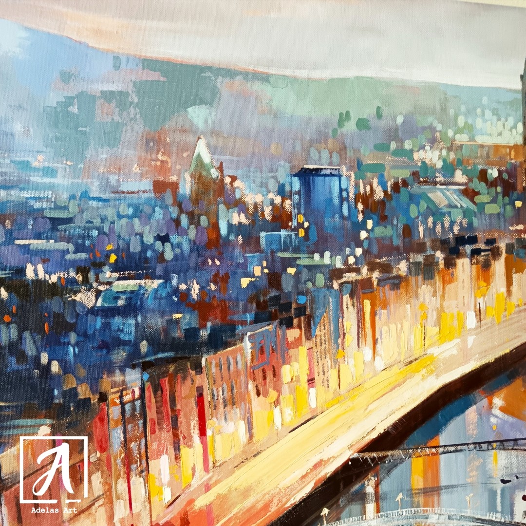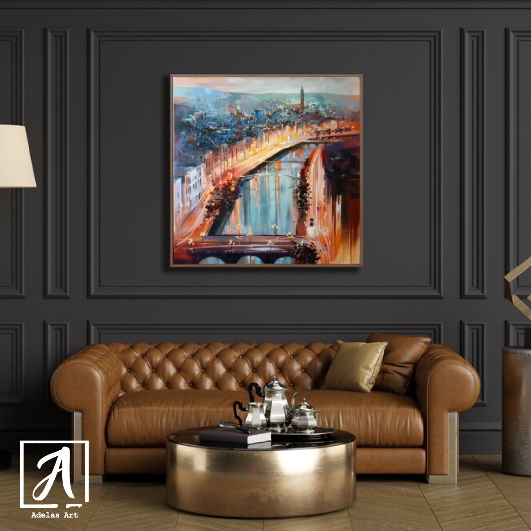 This original painting presents an aerial view of the Liffey River meandering through Dublin, illuminated by the soft light of dawn. The artist employs bold, sweeping brushstrokes to capture the city's architecture and natural elements with a dynamic, expressive flair.